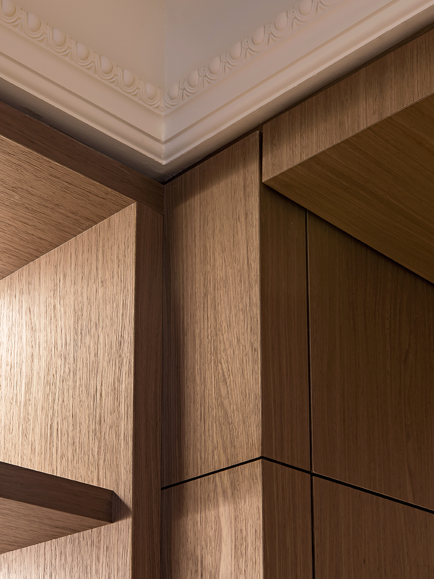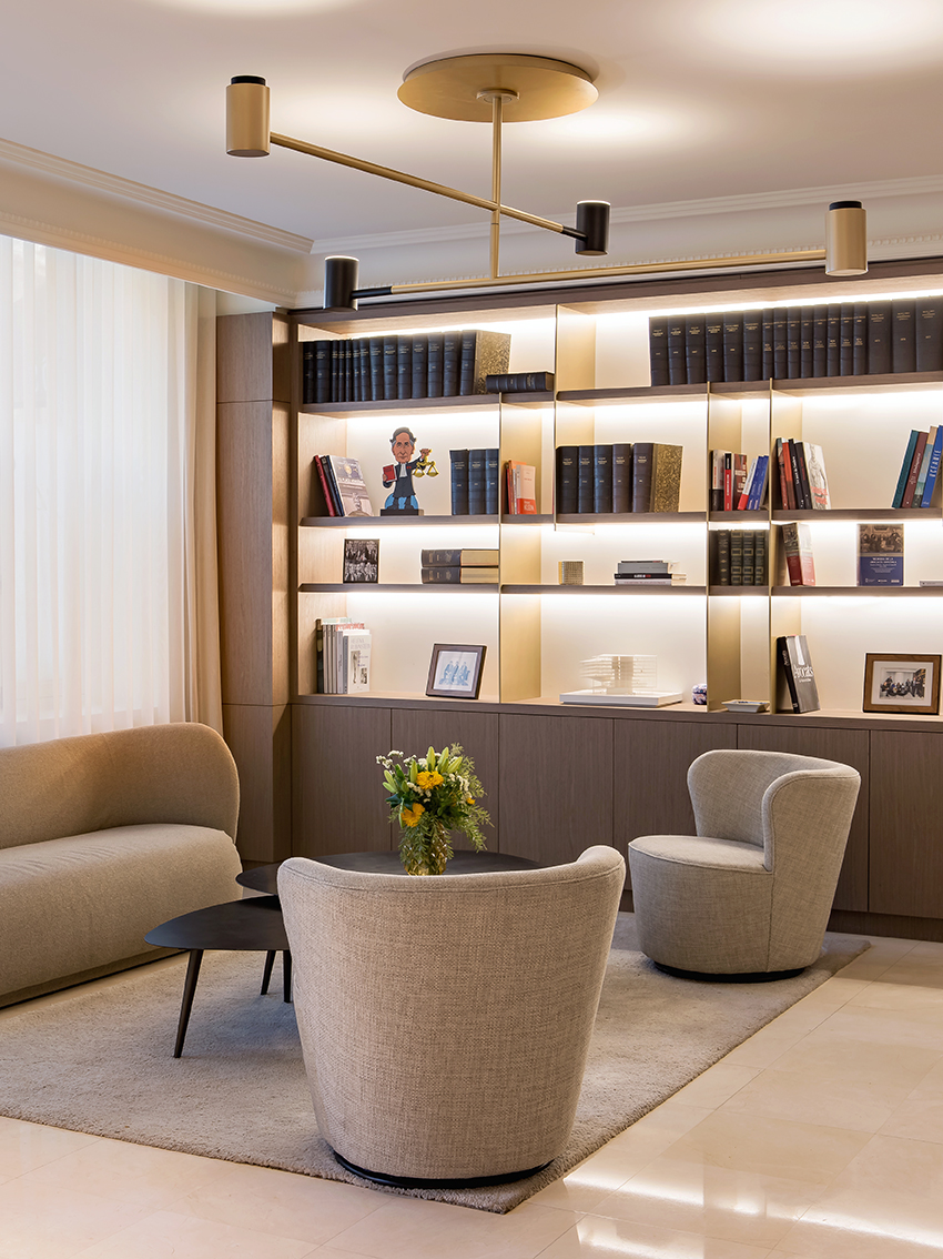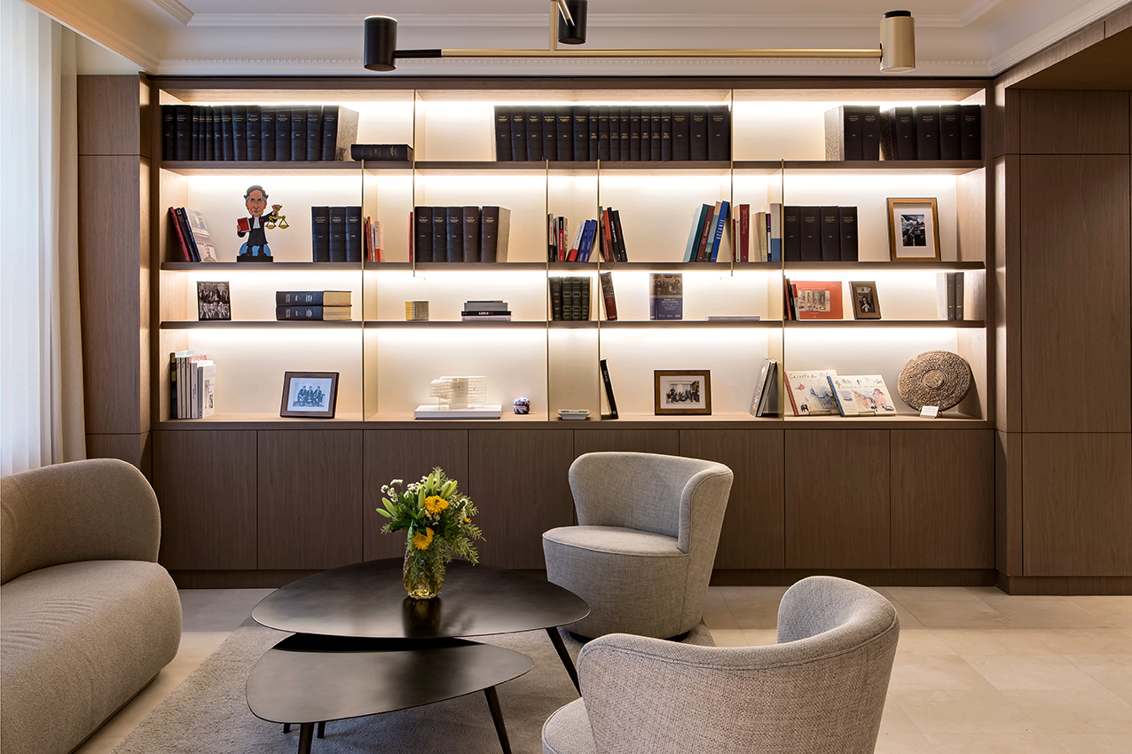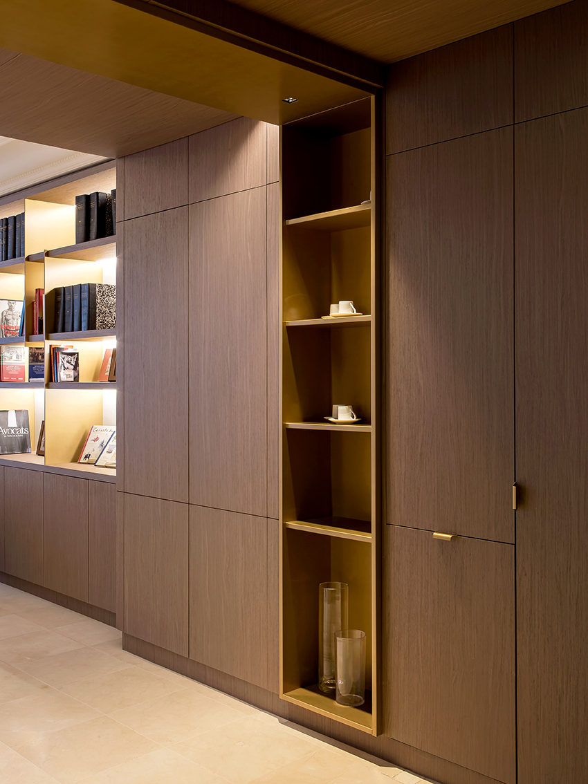 Découvrez l’univers chaleureux et sophistiqué du cabinet d’avocats FTMS à travers sa bibliothèque aux lignes pures, réalisée sur mesure en placage bois soulignés par des intercalaires en tôle laquée et son comptoir d’accueil sculptural. L’ensemble du projet s’articule autour d’une photographie de Raymond Depardon offerte à l’un des avocats du cabinet. Immortalisant la cour d’un palais de justice, il devient la pièce maîtresse du projet.